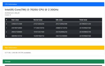 Uzantı, CPU bilgileri ile işlemcinin model adı, mimarisi ve çekirdek sayısı gibi detayları sunarken, RAM kullanımıyla mevcut ve toplam kapasite hakkında kesin bilgiler sağlar. Depolama detayları, cihaz kimlikleri ve toplam kapasiteleri ile birlikte sunulurken, ağ arayüzleri de bağlantı adları ve adresleri ile listelenmektedir. Ekran konfigürasyonu, bağlı ekranlar hakkında çözünürlük, yenileme hızı gibi bilgileri sunarak, çoklu monitör kurulumları için ideal bir yapı sağlar.